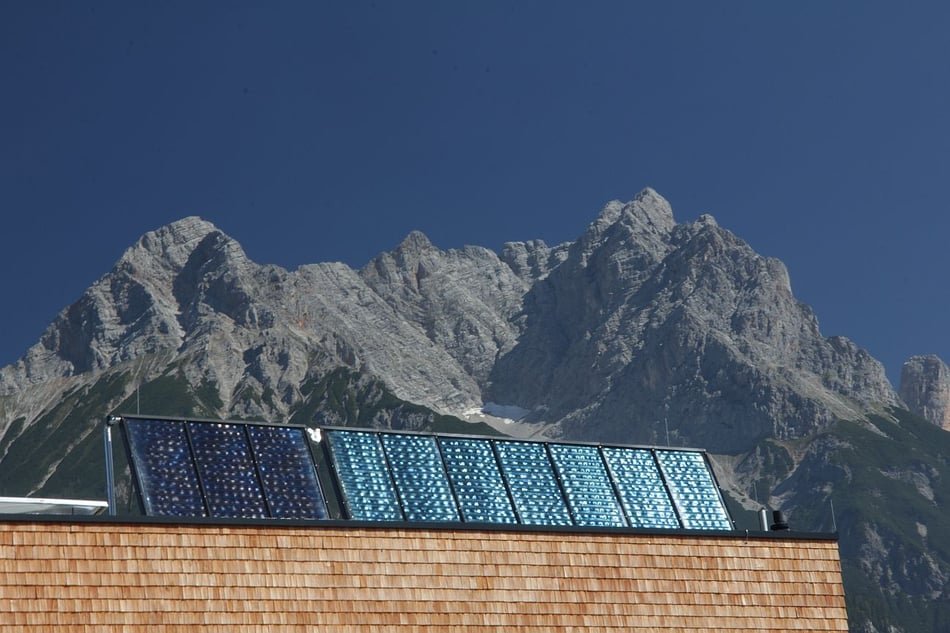 Die ökologische Visitenkarte des Hauses ist ein 133m² großer Solarkollektor, der durch den steilen Neigungsgrad nicht nur einen besonders hohen Wirkungsgrad in der Heizperiode garantiert, sondern gleichzeitig über acht Monate die Warmwasserversorgung von 20 Duschanlagen für mehrere Sportvereine gewährleistet.